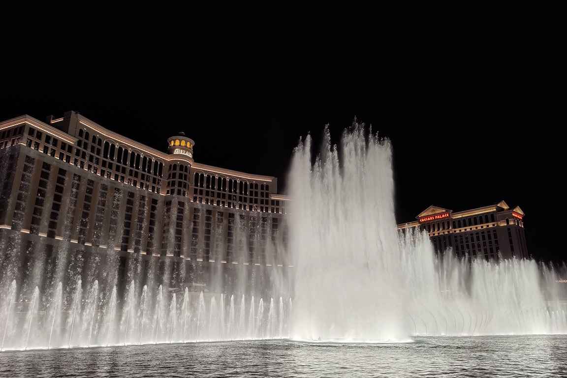 Bellagion maailmankuulu suihkulähdeshow on vartin välein, ja se on yhtä upean näköinen sekä etu- että takapuolelta katsottuna. Samoin matkalle osuus Miragen tulivuoro, joka iltaisin purkautuu sekin ilmaisessa näytöksessä tunnin välein.