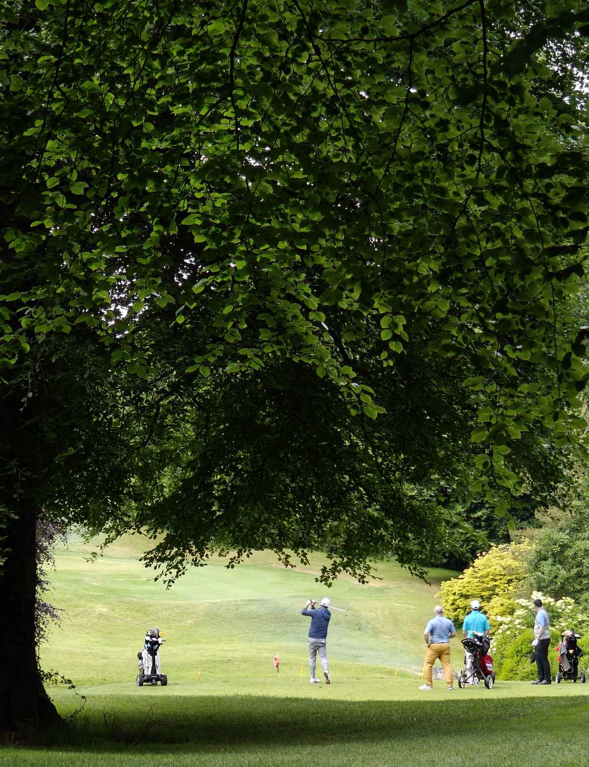 Pieni sadekaan ei haitannut upealla kentällä pelaamista. Tässä lyödään avausta yli edellisen viheriön.