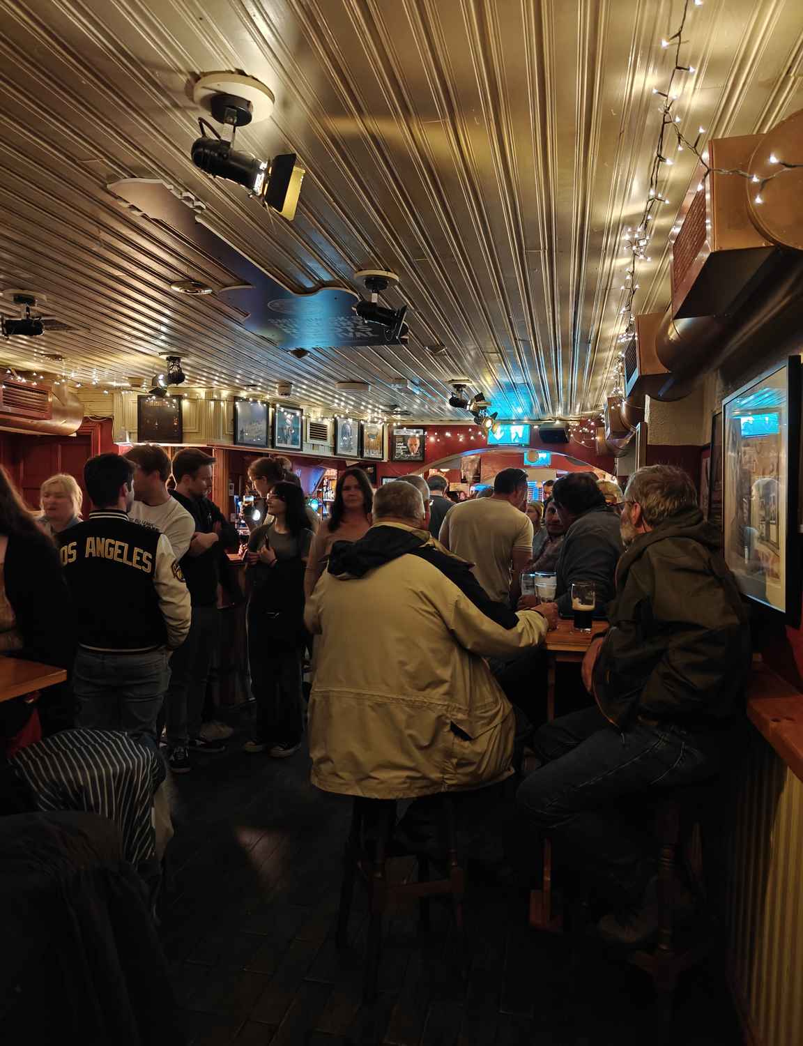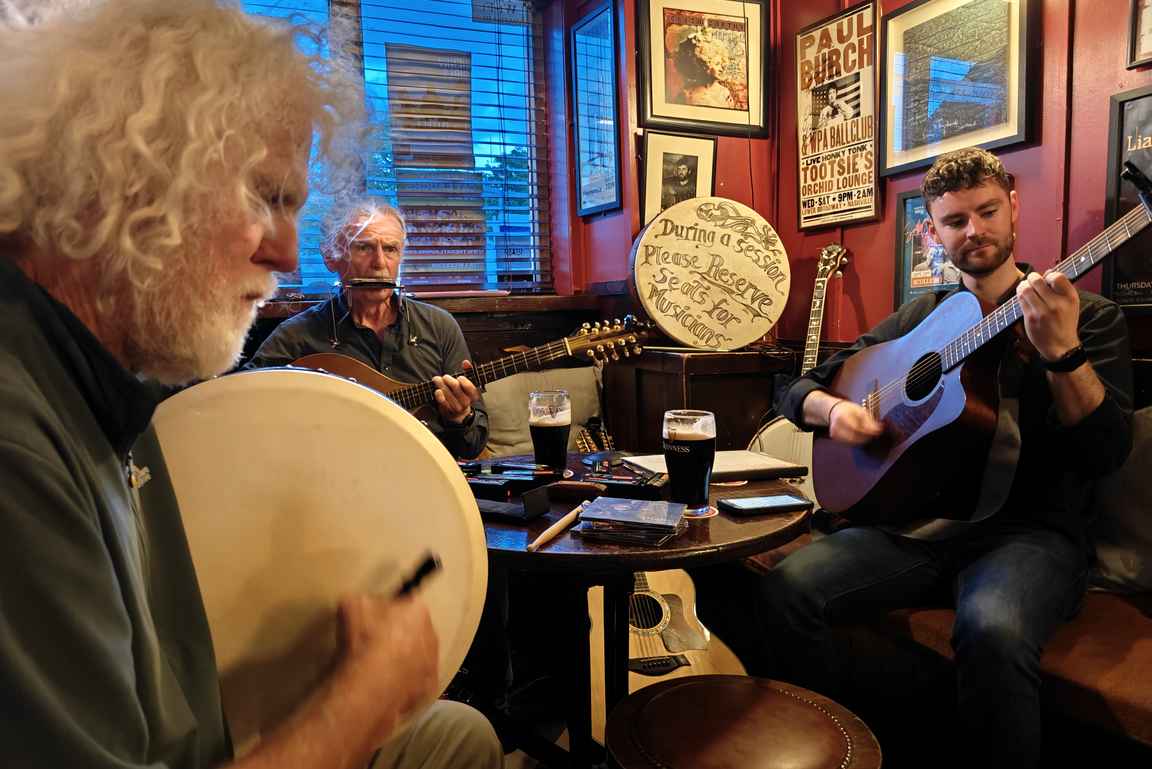 Cleere’sin maanantai-iltojen soittaminen alkaa klo 21, mutta pub on täynnä porukkaa jo puolisen tuntia ennen aloitusta. Kannattaakin mennä ajoissa paikalle varaamaan hyvä paikka, tai toimia niin kuin itse, kysyen onko bändin viereisen pöydän ranskalaisdaamien seurassa tilaa. Ja olihan sitä, istuimmekin Ilin kanssa koko musiikkisession ”bändin jäseninä” omana vahvuutenani pöytärummut.