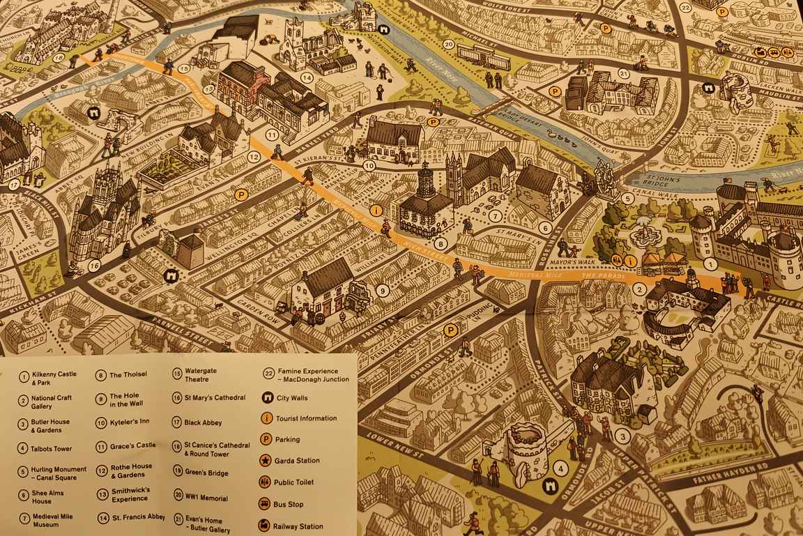 Kilkennyn kaupungin jakautuu Nore-joen pohjois- ja eteläpuolelle. Historiallinen keskusta Kilkennyn linnoineen on joen eteläpuolella, samoin kuin majapaikkamme Kilkenny Ormonde Hotel ja kaupungin kuuluisa Medical Mile, jossa sijaitsee suurin osa kaupungin tärkeimmistä nähtävyyksistä. Tällä kerralla keskityimme tälle alueelle valikoiden kohteeksi viisi kiinnostavaa pubia, joista pääkohteeksi valikoitui John Cleere’s Bar & Theatre. Muut kohteet olivat kierroksella Kyteler’s Inn, Bollard Bar & Bistro, Lanigan’s Bar ja Matt the Millers.