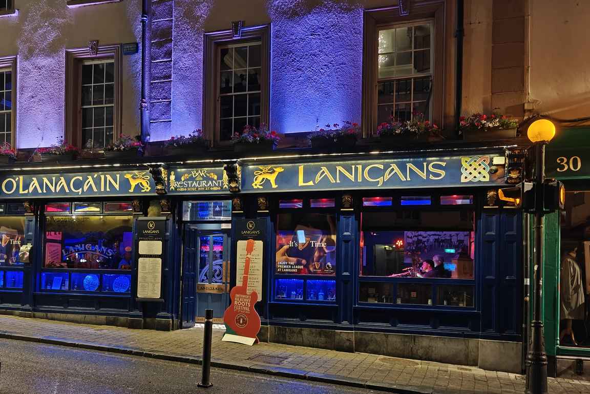 Lanigan’s Bar kiinnitti huomiota ajellessamme kohti majapaikkaamme saapuessamme Kilkennyn keskustaan. Upea sininen ulkosivu suorastaan houkutteli kutsumaan sisälle, ja Lähtöportin Mika oli sitä muutenkin suositellut blogissaan kaupungin parhaisiin kuuluvana sporttibaarina. Tällä kerralla ei mitään urheilua ollut iltapelien muodossa tiedossa, mutta sitä vastoin täälläkin oli livemuusikot estradilla. Lanigan’s ei siis ole mikään sanan varsinaisessa merkityksessä perinteinen pub, mutta uskoakseni parhaillaan juuri urheilun seuraamisessa.