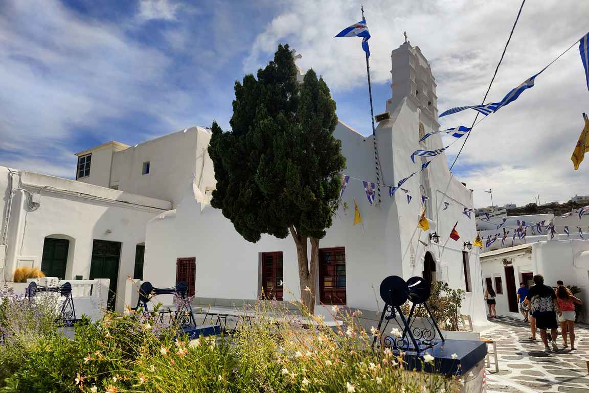 Mykonoksen kaupungin sataman edustalla sijaitseva Panagia Paraportiani -kirkko on yksi Mykonoksen vanhimmista ja tunnetuimmista rakennuksista. Se on itse asiassa viiden eri aikakaudella rakennetun kappelin yhdistelmä, mikä tekee siitä arkkitehtonisesti ainutlaatuisen rakennuksen. Valkoista kalkkikiveä hohtava kirkko on suosittu vierailukohde niin uskonnon kuin valokuvauksenkin näkökulmasta. Se olikin sisätiloista Choran ainoita rauhallisia paikkoja, missä kuuli jopa oman ajatuksensa.