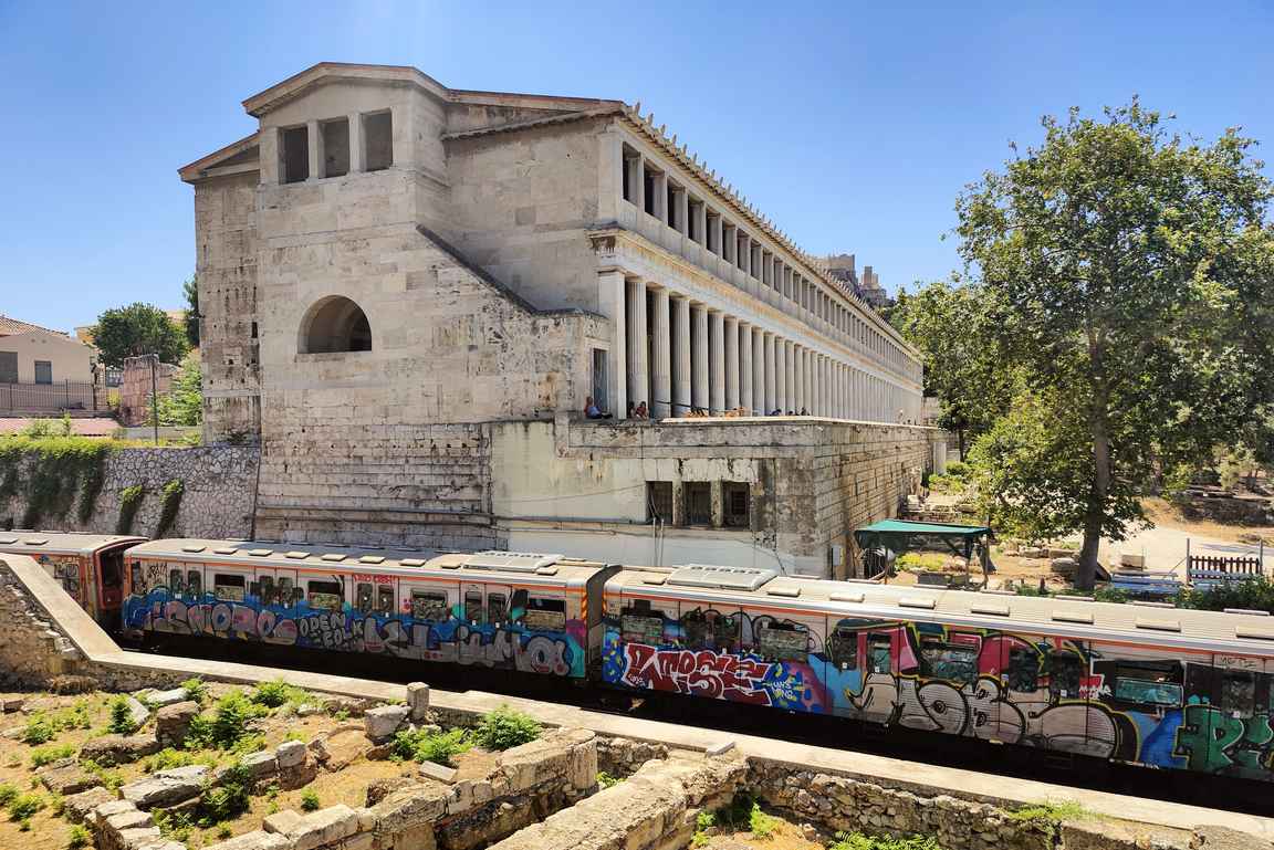 Historia ja nykyaika kohtaavat Agora-museon edustalla grafiittimaalattujen metrovaunujen ohittaessa antiikin ajan korkeakulttuurin kehdon.