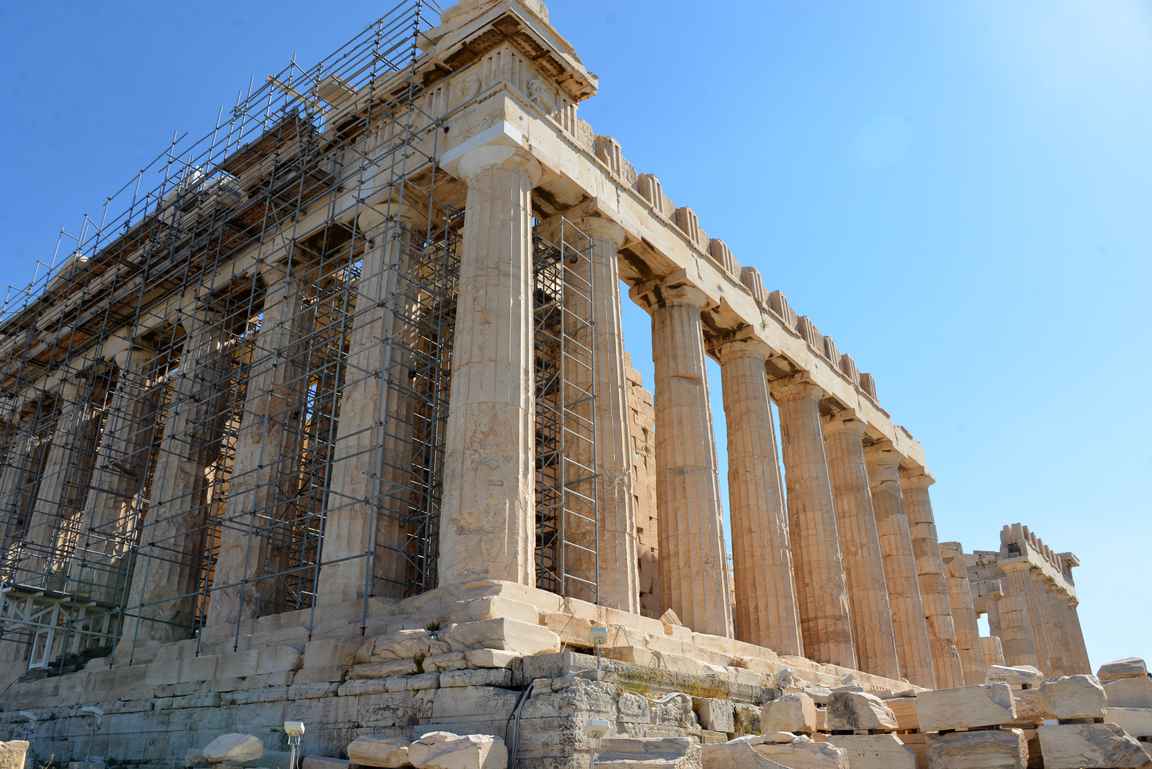 Kreikkalaisen sivistyksen kultakauden suurin saavutus on Ateenan yläkaupunki Akropolis. 400-luvulla ennen ajanlaskumme alkua tälle Ateenan korkeimmalla kohdalla sijaitsevalle linnavuorelle rakennettiin kaupungin suojelupyhimyksen Neitsyt Athenen kunniaksi iso doorilainen temppeli, joka tunnetaan nimellä Parthenon. Se on Ateenan kuuluisin rakennus ja meidän länsimaisen sivistyksemme esikuva arkkitehtuurille Akropoliksella sijaitsevien muiden rakennusten kanssa. Näistä upeimpia ovat Niken temppeli, Erekhtheion koristeisine pylväikköineen ja Herodes Atticuksen teatteri.