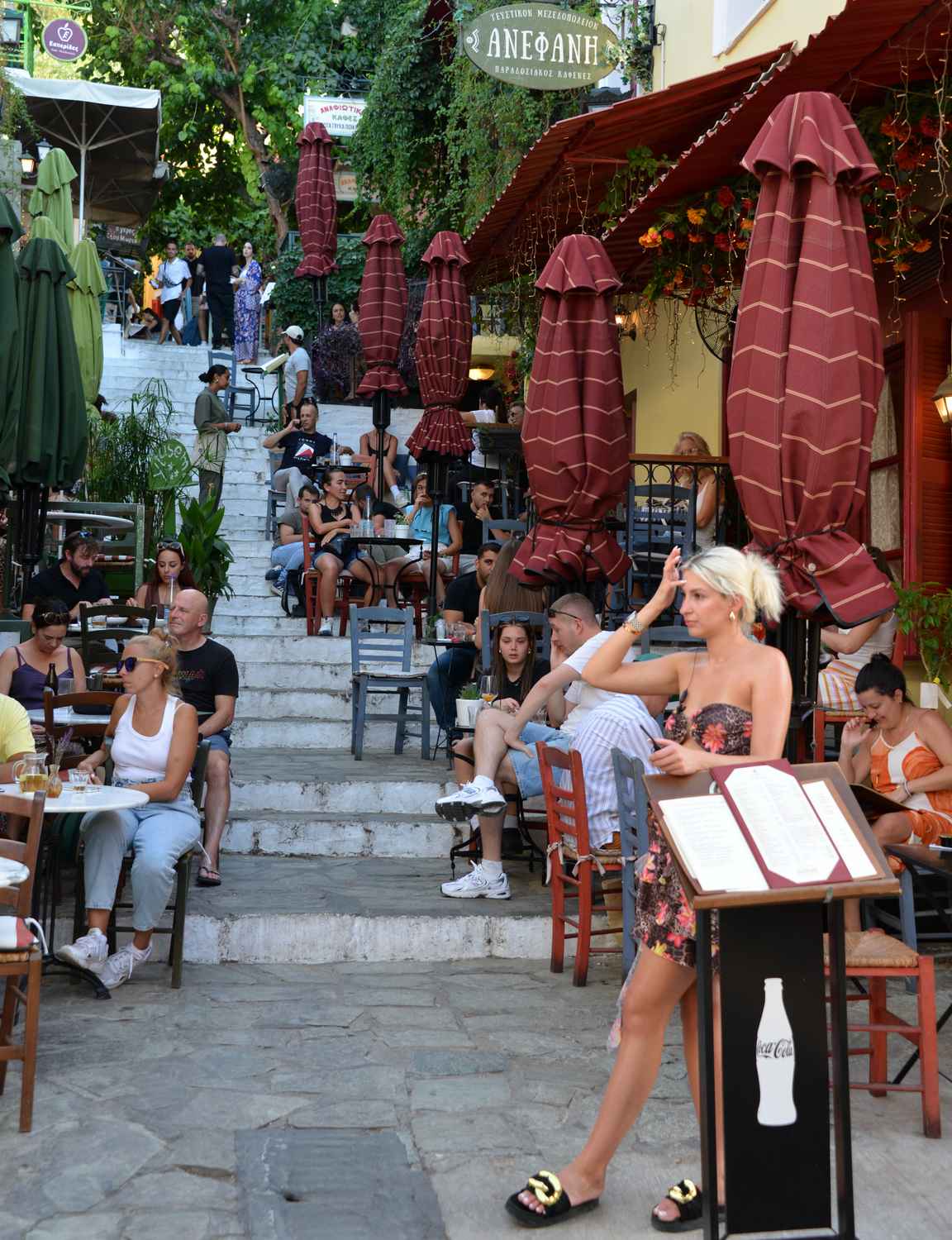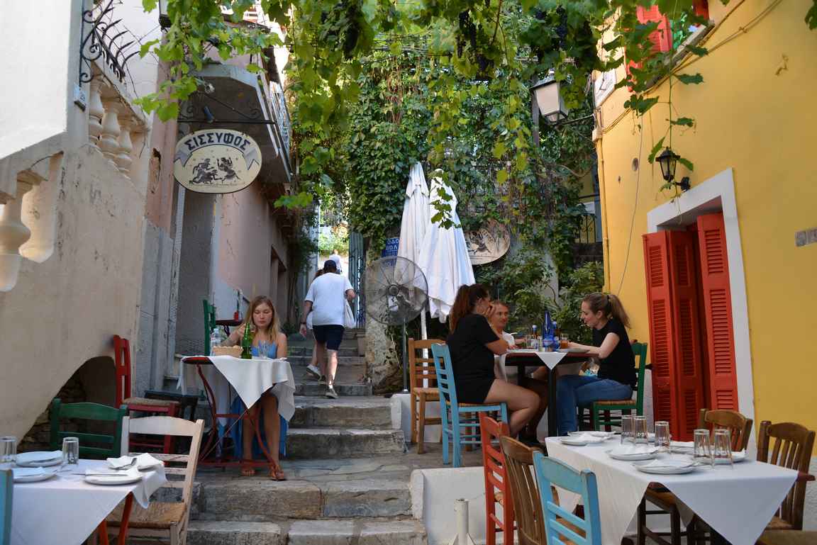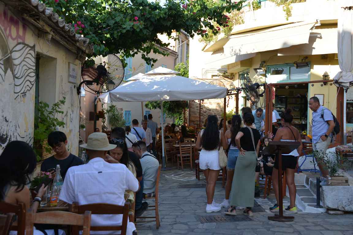 Mnisikleousen varrella on mukavia kahviloita ja ravintoloita missä nauttia Plakán kaupunginosan tunnelmasta.