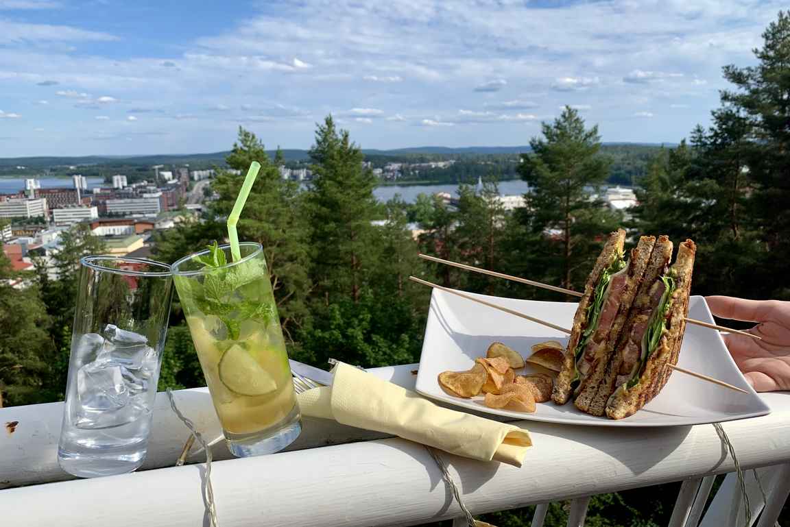Café & Restaurant Vesilinnan ravintolan aukioloaikoina on pääsy vielä korkeammalle ylös Harjun näkötorniin ihailemaan Jyväskylän maisemia ilman pääsymaksua.
