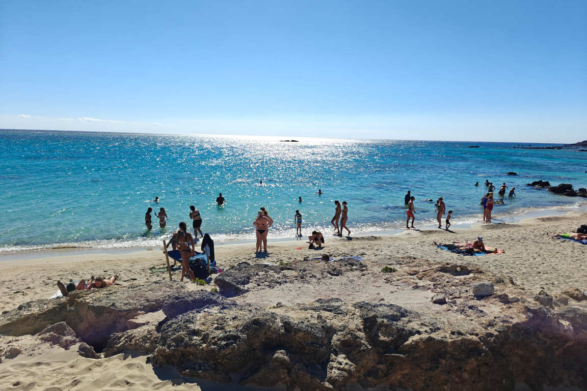Matalan Elafonnissin rannan luonnonsuojelualueen dyynien takana on vielä toinenkin kivikkoinen ranta, joka vesi on jopa vieläkin turkoosisempi. Tällä rannalla uimisen lisäksi monella aika keskittyy valokuvien ottamisessa, mikä ei ole ihme.